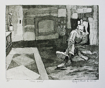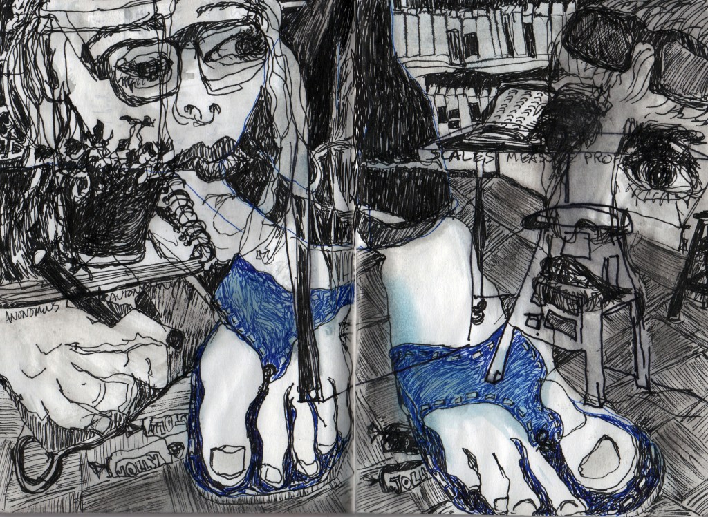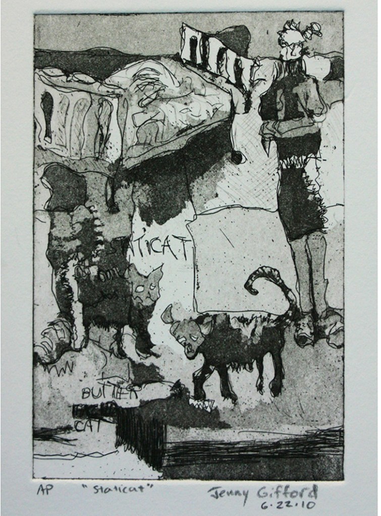 I take my sketchbook everywhere and record people and places with squiggly, jumbled details. Sometimes I use sketchbook drawings to create new compositions for prints and paintings.
